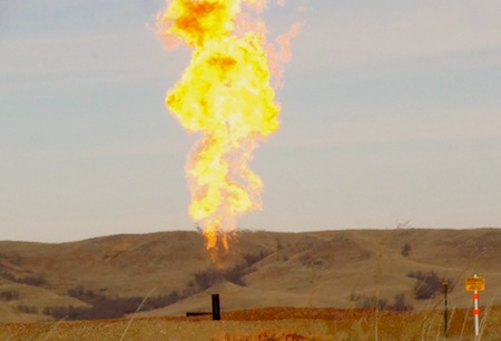 At night, the 200 drilling rigs operating around Williston are lit as bright as carnival rides, white towers of floodlight groaning ceaselessly against the black. By day, the orange flames of gas flares superheat the air at completed production sites. (See pix above).